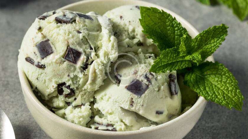 Fresh mint ice cream bowl with chocolate chips and lime juice